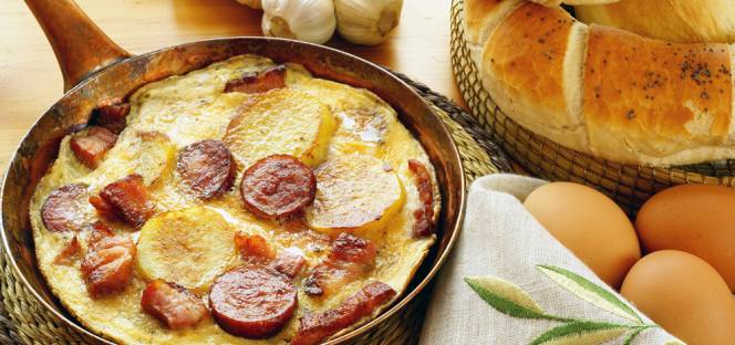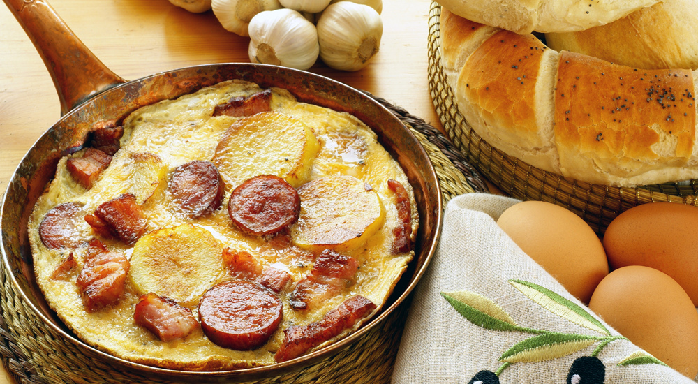 - Τοποθετούμε ξανά στο τηγάνι τα λουκάνικα και τις πατάτες και περιχύνουμε με το μίγμα των αυγών.