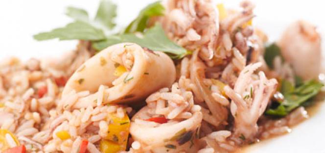 - Σε μια κατσαρόλα ζεσταίνετε το ελαιόλαδο και σοτάρετε ελαφρά τις κόκκινες πιπεριές και τα καλαμαράκια.
