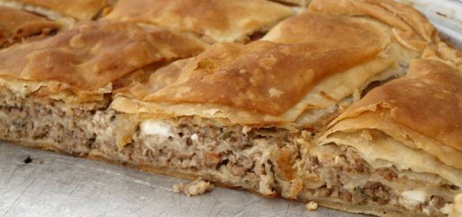 Σε μια λεκάνη βάζουμε το αλεύρι, το κρασί, το λάδι, το νερό και το αλάτι. Ζυμώνουμε ώσπου να γίνουν μια μαλακή και εύπλαστη ζύμη. Την χωρίζουμε σε δύο κομμάτια (το ένα λίγο μεγαλύτερο) και ανοίγουμε δύο φύλλα με τον πλάστη (όχι λεπτά).