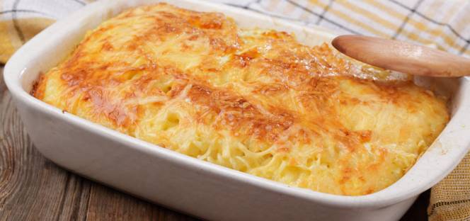 - Ρίχνουμε την κρέμα γιαουρτιού και τα υπόλοιπα τυριά και ψήνουμε στους 180ο C για 35-40 λεπτά, σε προθερμασμένο φούρνο, μέχρι η μακαρονόπιτα να πάρει χρώμα.