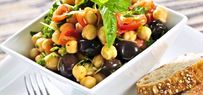 - Ψιλοκόβετε τις πιπεριές και τις τοποθετείτε σε ένα μεγάλο μπολ μαζί με τα ρεβύθια, τις ελιές και τον μαιντανό. Περιχύνετε με το λάδι και τον χυμό λεμονιού και αλατοπιπερώνετε.
