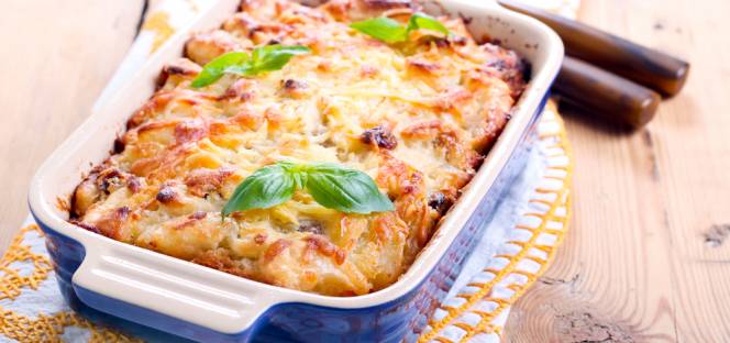 - Ρίχνουμε τις πέννες ωμές και προσθέτουμε τις πιπεριές και το μπέικον από πάνω αφού το έχουμε τσιγαρίσει πρώτα.